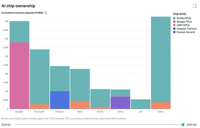 Owners of the world’s AI compute: Leading AI chips are distributed among hyperscalers and other major players, broken down by chip type over time.