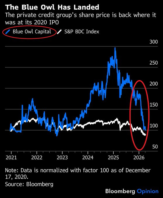 Private credit in trouble: Blue Owl Capital, the poster child of the private credit boom, just closed at a record low. The stock fell -1.4% to $8.45 on Monday, slipping below its previous low from late 2022, and is now down -68% from its all-time high.