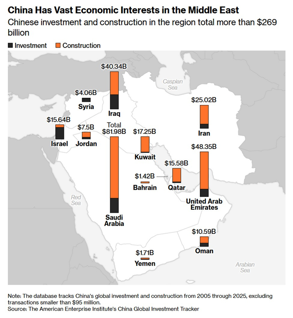 China has massive economic exposure to the Middle East: China has spent over $269 billion on investments and construction contracts across the Middle East since 2005. Saudi Arabia is the largest recipient at $82 billion, followed by the UAE at $48 billion, and Iraq at $40 billion.