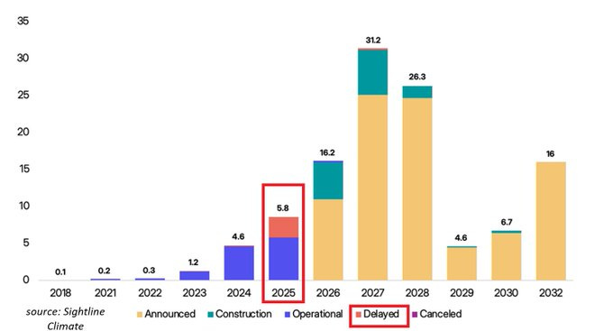 The AI data center construction be hitting a wall: ~16.2 GW of data center capacity is expected to come online in 2026, but only ~5 GW is currently under construction, according to Sightline Climate.