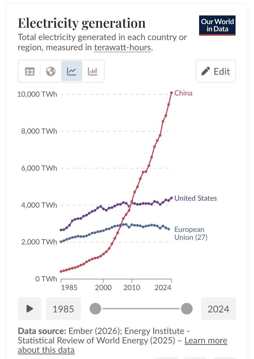 China now produces nearly 40% more electricity than the US + EU combined.