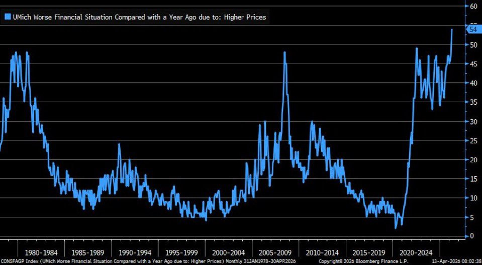 Consumer weakness: 54% of consumers now say their financial situation compared to a year ago is worse due to higher prices, the most in history.