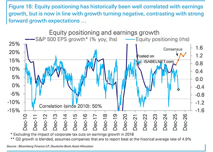 Equity positioning: Equity positioning is bracing for a sharp earnings slowdown, but recent data are undermining that story. If the gloom fades, risk appetite may rebound fast and lift stocks.