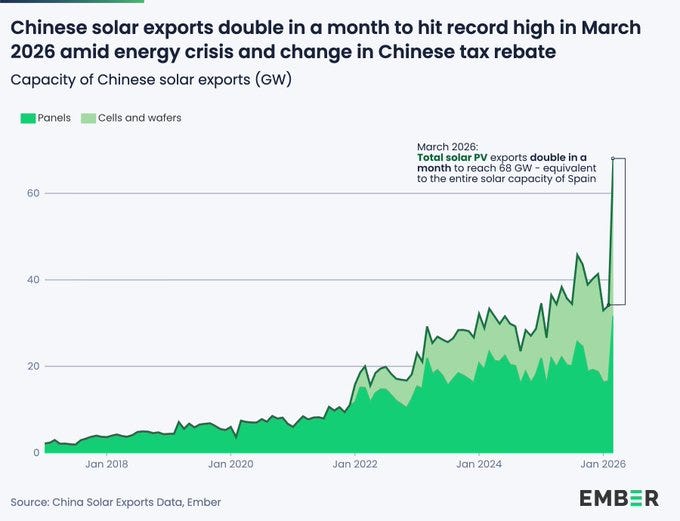 Chinese solar exports: Chinese solar exports hit a record 68 GW in March 2026, double the previous month.