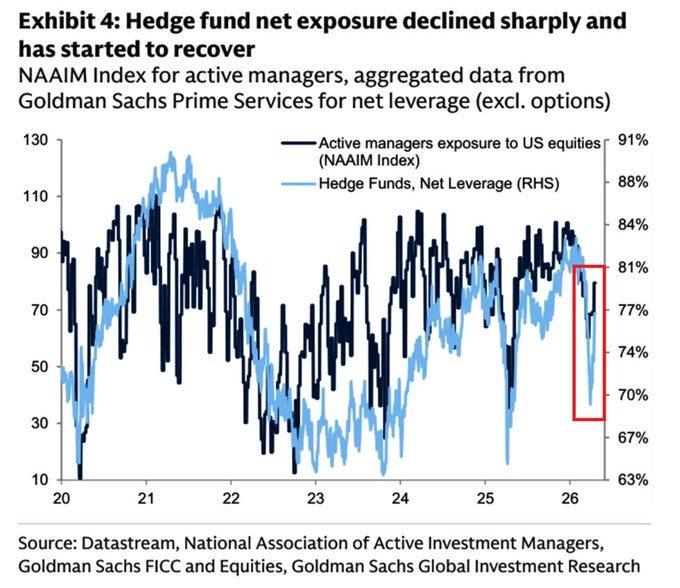Institutional investors are rebuilding their equity exposure: The NAAIM Exposure Index has jumped +19 points over the last 4 weeks, to 79, the highest since mid-February. This index measures average US equity exposure reported by members of the National Association of Active Investment Managers, making it a key indicator of professional investor positioning. At the same time, hedge fund net leverage has risen +8 percentage points to 77%, the highest since early March.