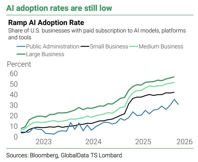 AI adoption: AI adoption among large US companies is currently at 56% according to RAMP AI data. This suggests there is plenty of room for further increases, which should translate into stronger demand for compute.