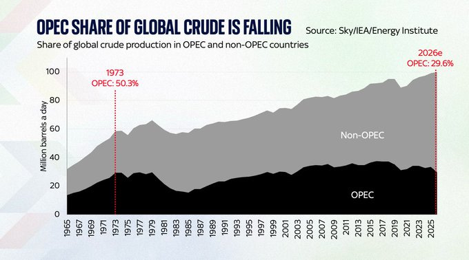 OPEC Relevance Falling. Back in 1973 OPEC Accounted for Just Over Half of ALL Global Oil Production. Its Share Was Already Down to a Third in 2025