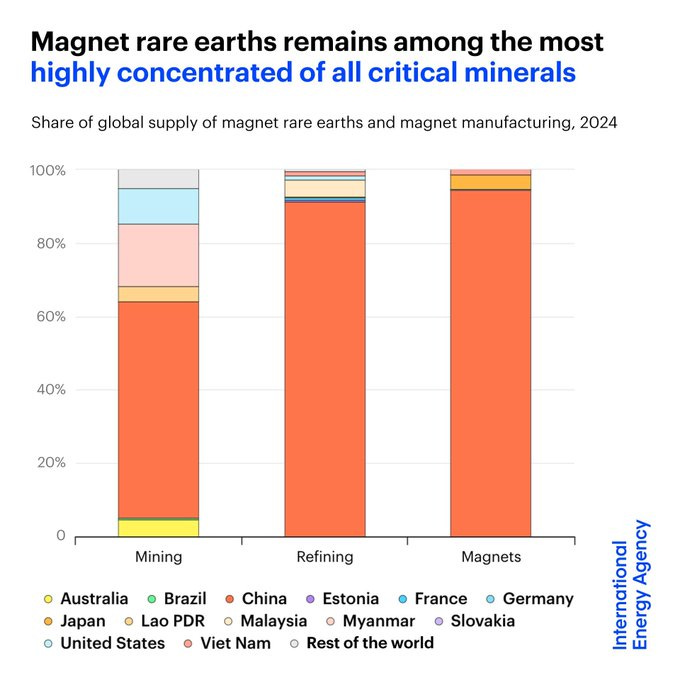 Magnet rare earths: Supplies of rare earths used to produce high-performance magnets are among the most highly concentrated of all critical minerals.