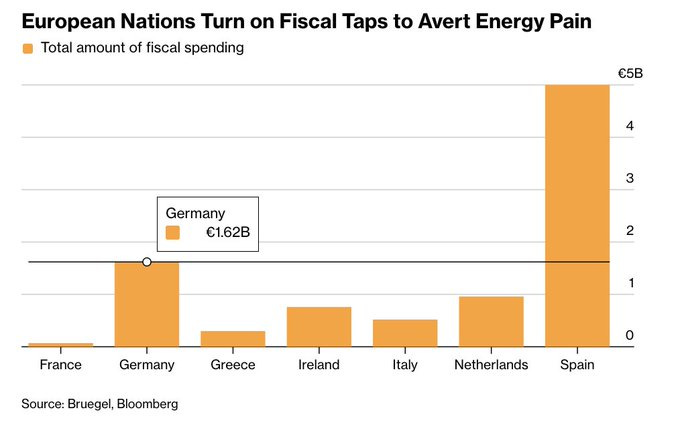 Germany: Government plans to spend €1.6bn to shield consumers from rising energy prices. That makes Germany the No. 2 spender in Europe far behind Spain.