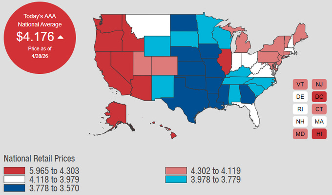 Oil prices by U.S. state: BREAKING: The average price of a gallon of gas in the US rises to $4.18, the highest level since August 22.